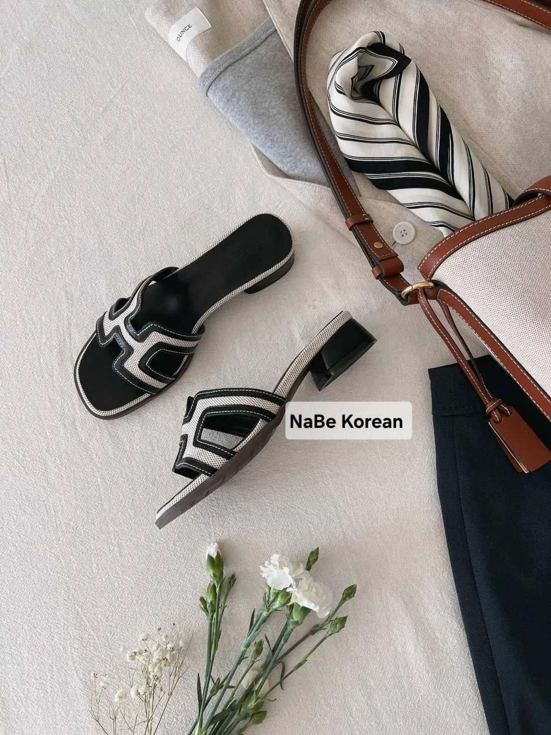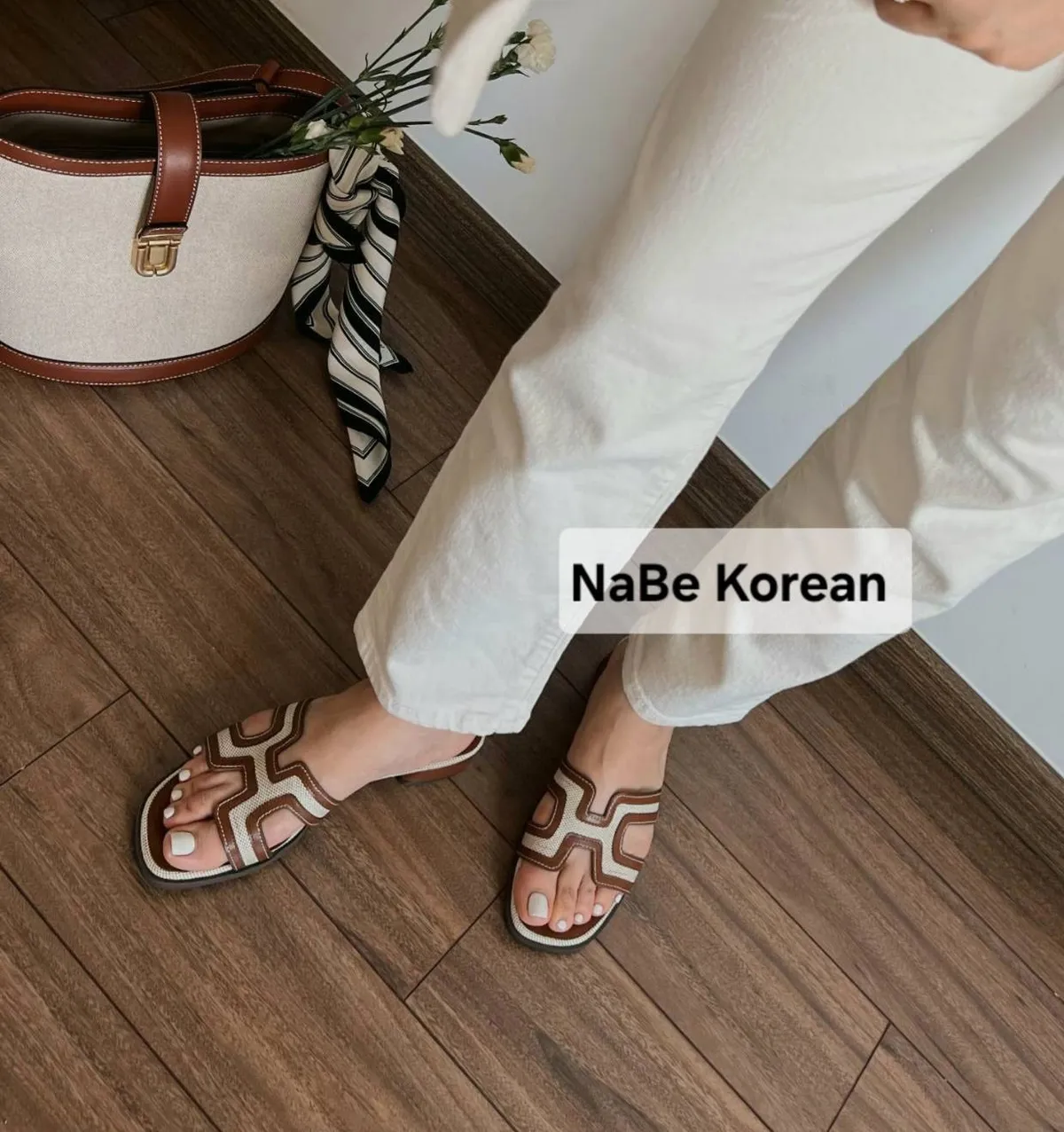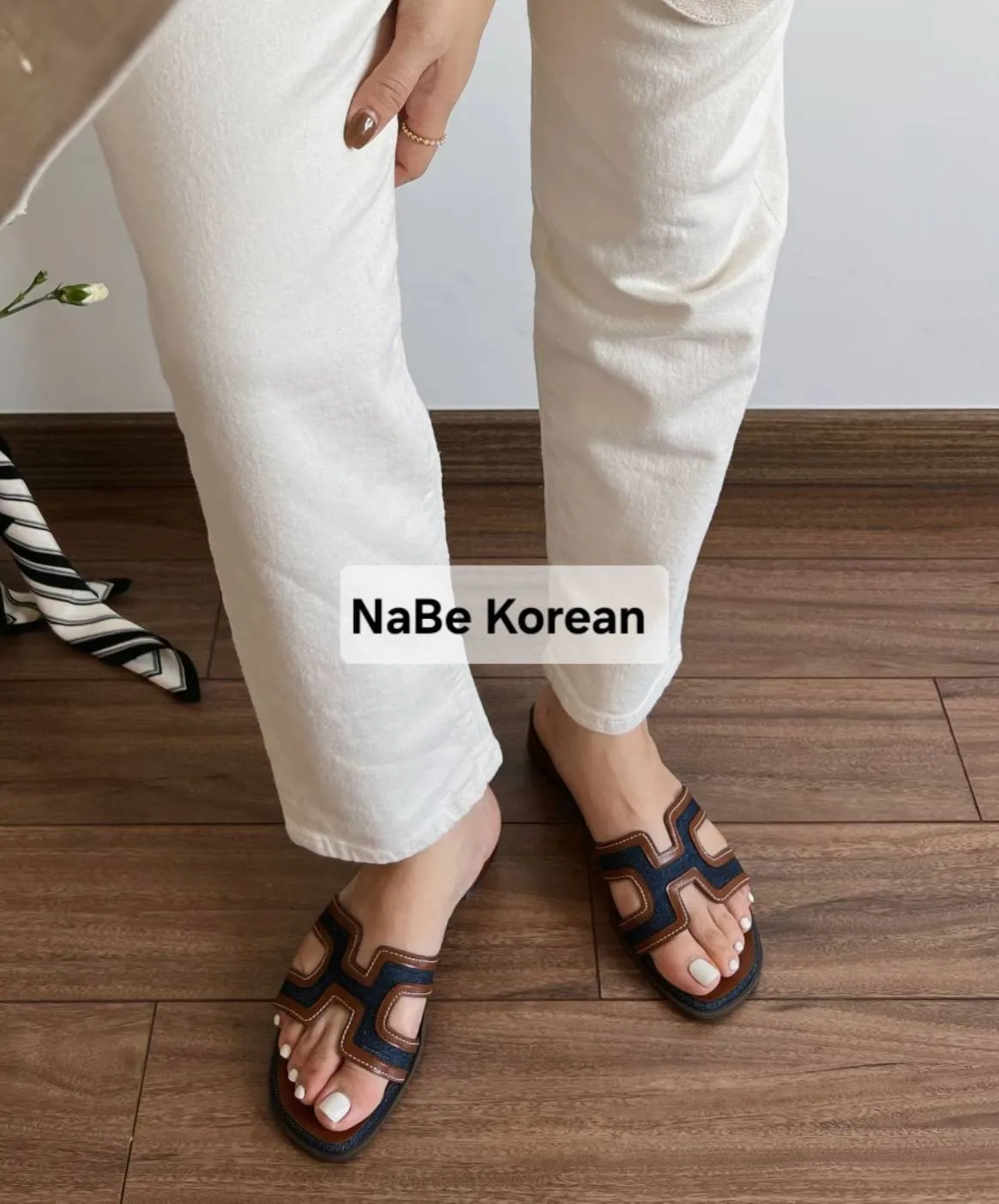 NaBe Korean-H 撞色 高質感 皮革低跟拖鞋 3公分