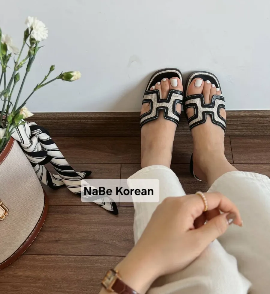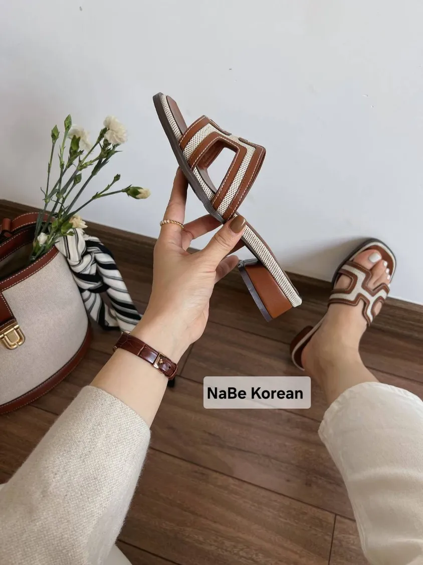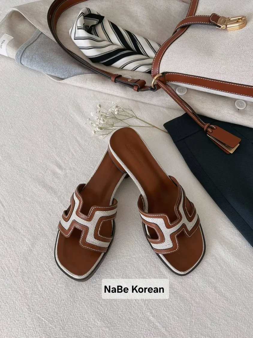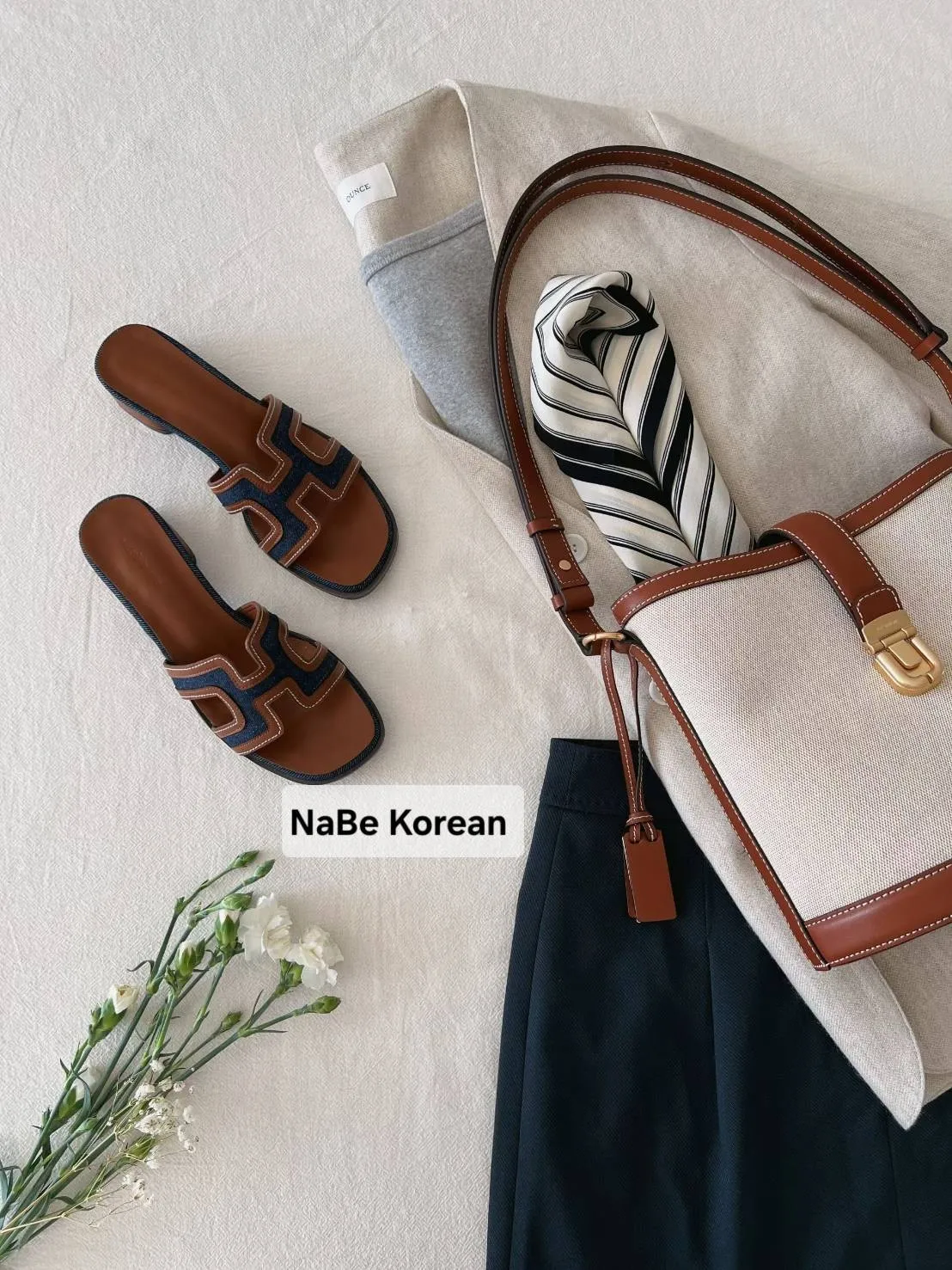 NaBe Korean-H 撞色 高質感 皮革低跟拖鞋 3公分