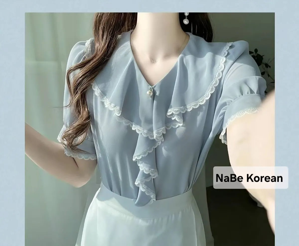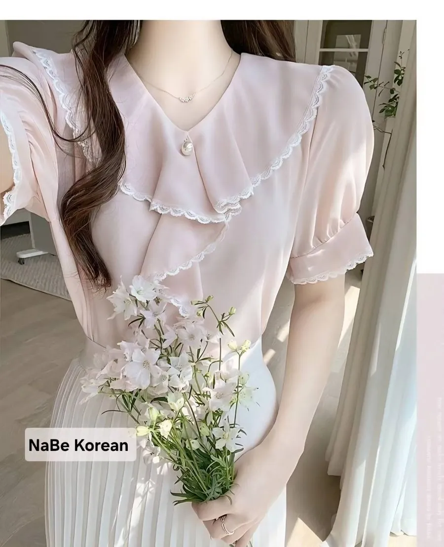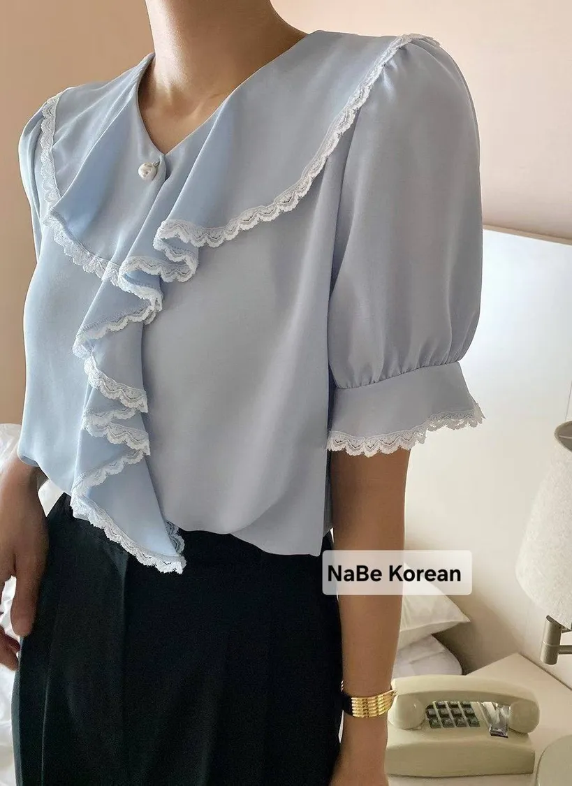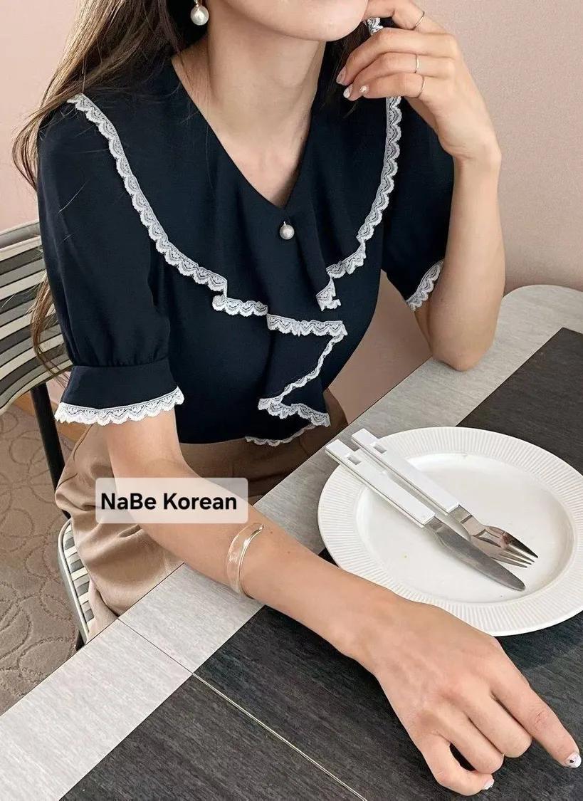 NaBe Korean-質感蕾絲包邊 造型高級領 雪紡上衣