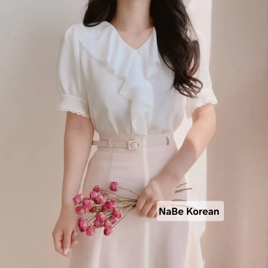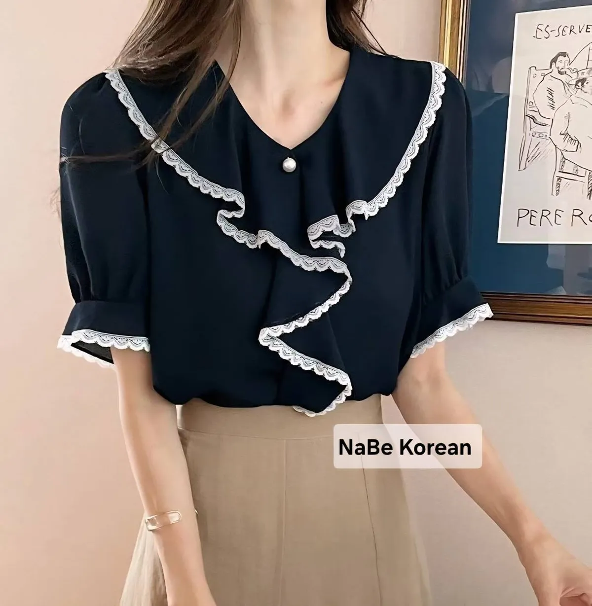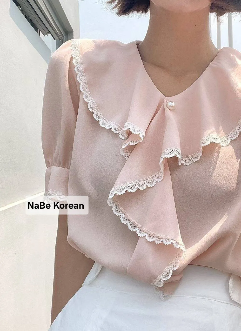 NaBe Korean-質感蕾絲包邊 造型高級領 雪紡上衣