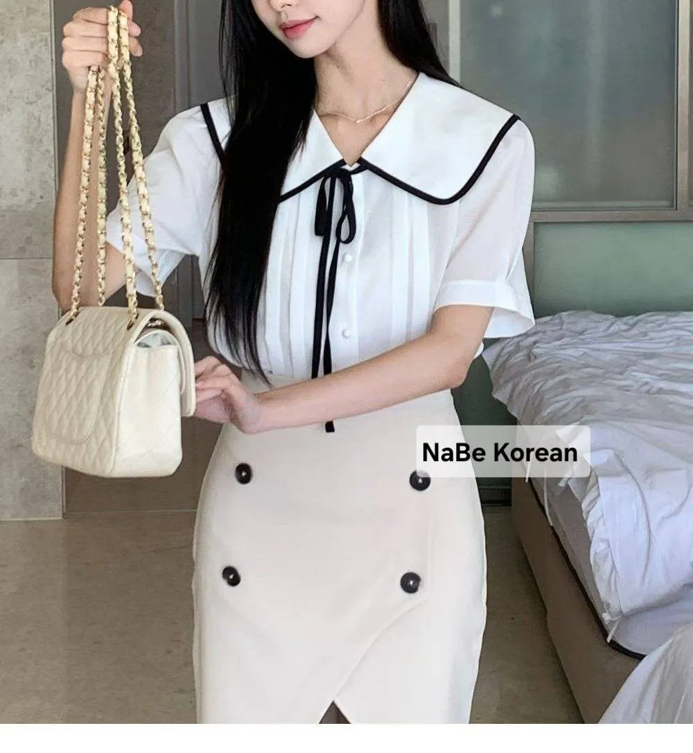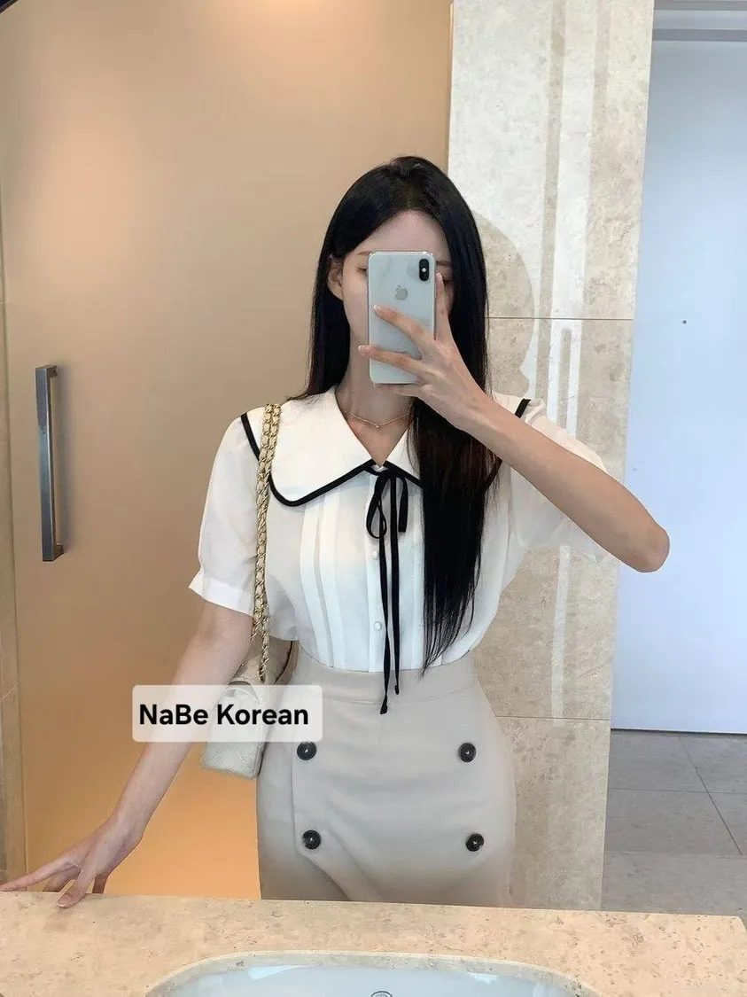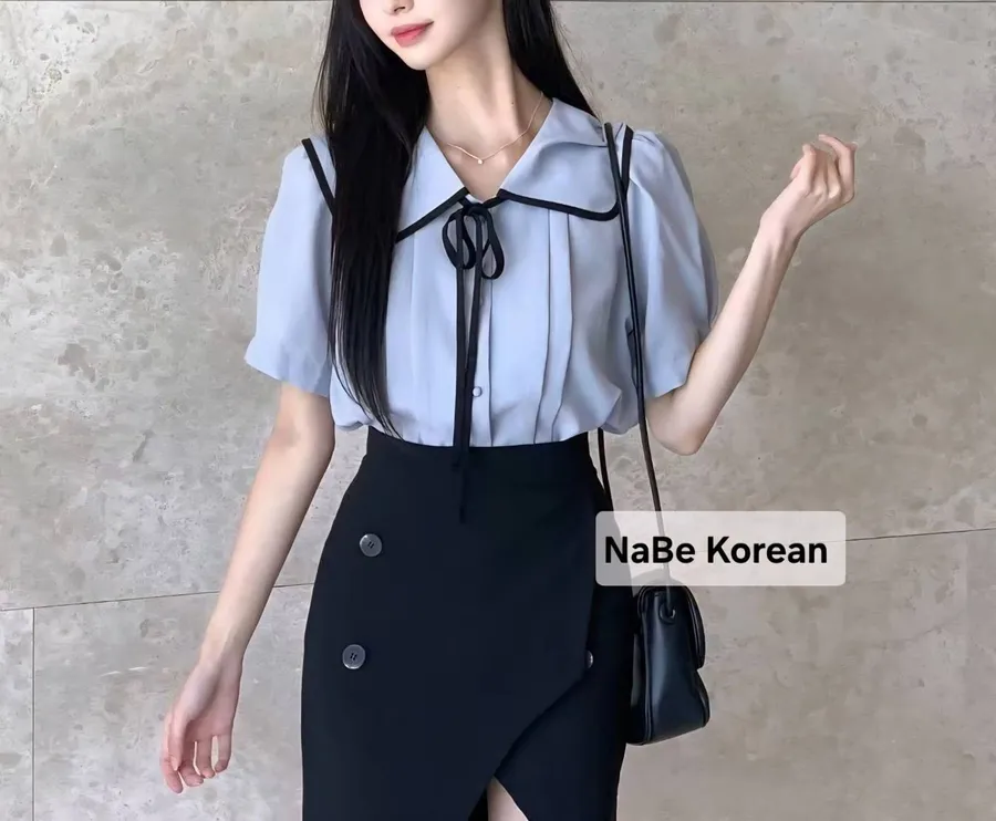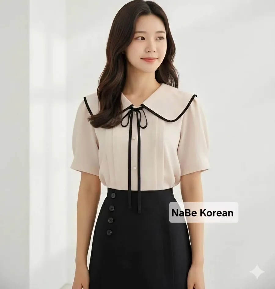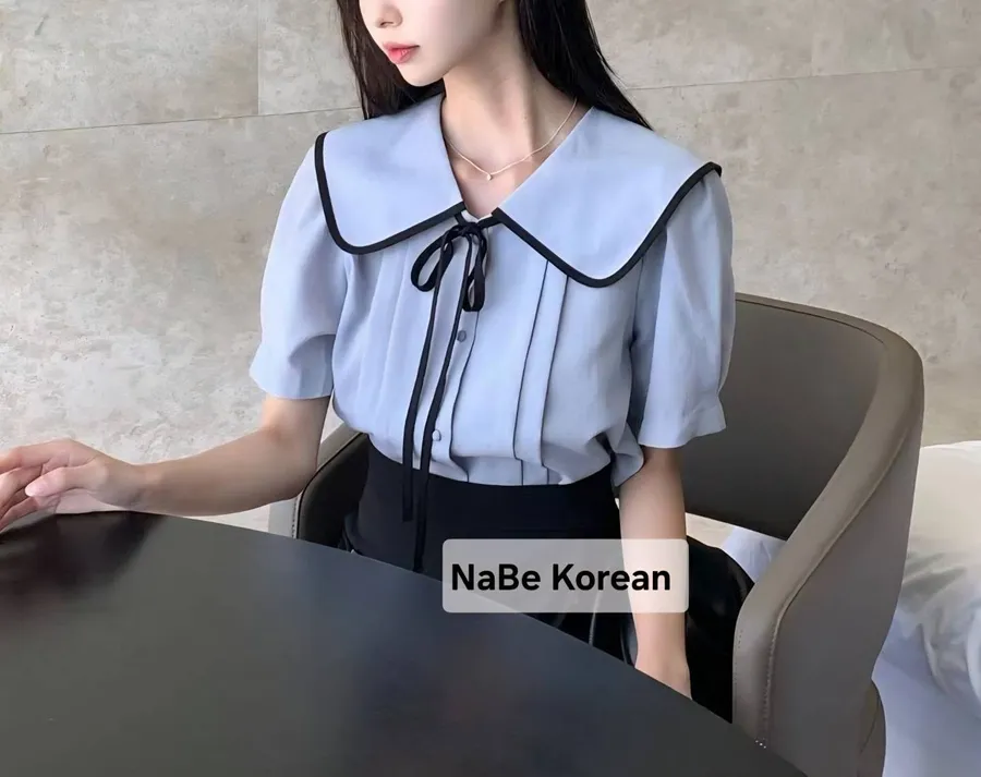 NaBe Korean-大翻領 質感線條蝴蝶結上衣