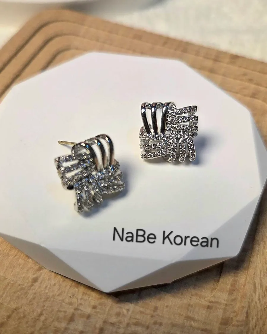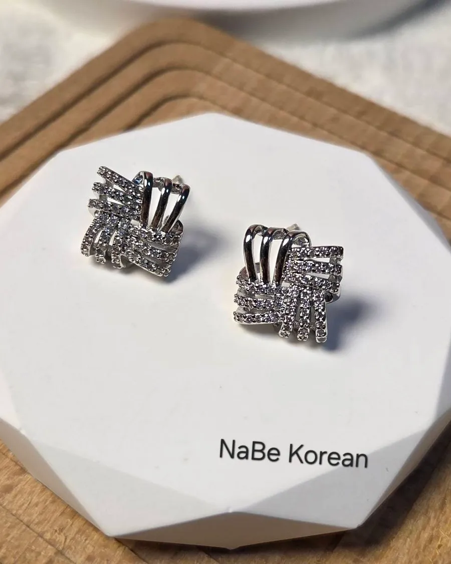 NaBe Korean-時尚編織方形鑲鑽造型耳環(純銀針)